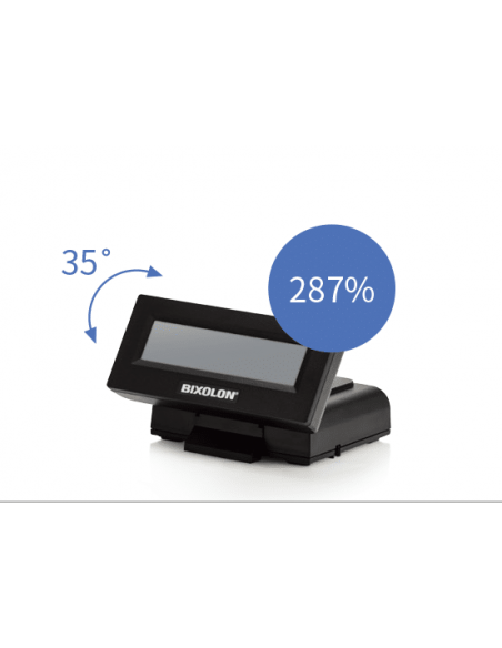 Le mini afficheur BCD-3000 est le plus petit afficheur client de Bixolon. Ce mini-afficheur client avec écran LCD super Twister Nematic est environ 287% plus petit qu'un afficheur client standard. Affichage mono-LCD amélioré doté d'une luminosité variable, 2 lignes de texte, un alignement de caractères flexible (Horizontal, vertical, police et interligne) et un alignement de texte réglable (centre, gauche et droite). Utilitaire de chargement d'image et d'affichage simple. L'afficheur client présente plusieurs trajectoires de câble en vue de faciliter la gestion et un angle de 0 a 35°. Présentant une configuration USB simple de type plug and play. L'afficheur est compatible avec tous les principaux systèmes d'exploitation, dont Android, iOS et Windows
