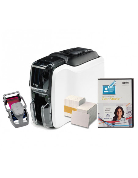 Le pack Zebra ZC 100 est un pack complet prêt à utiliser incluant une imprimante de carte badge, le logiciel d'édition de cartes badges et le consommable.
